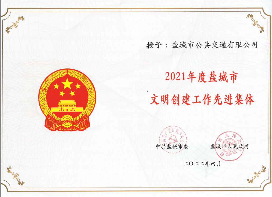• 2022年4月公司被授予2021年度鹽城市文明創(chuàng)建工作先進(jìn)集體榮譽(yù)稱號(hào)